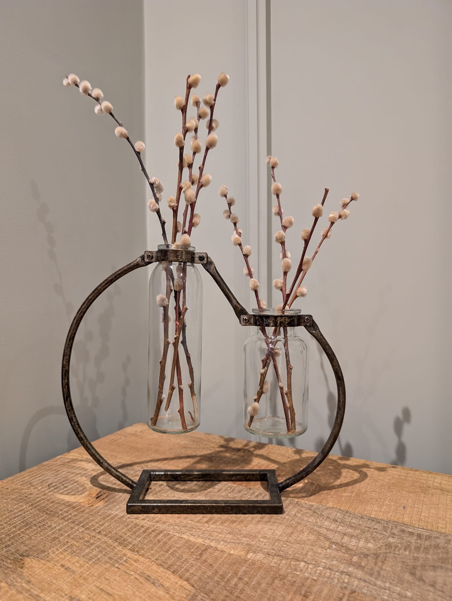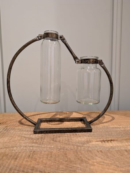 Two clear glass bottle vases held in a rustic-style metal frame